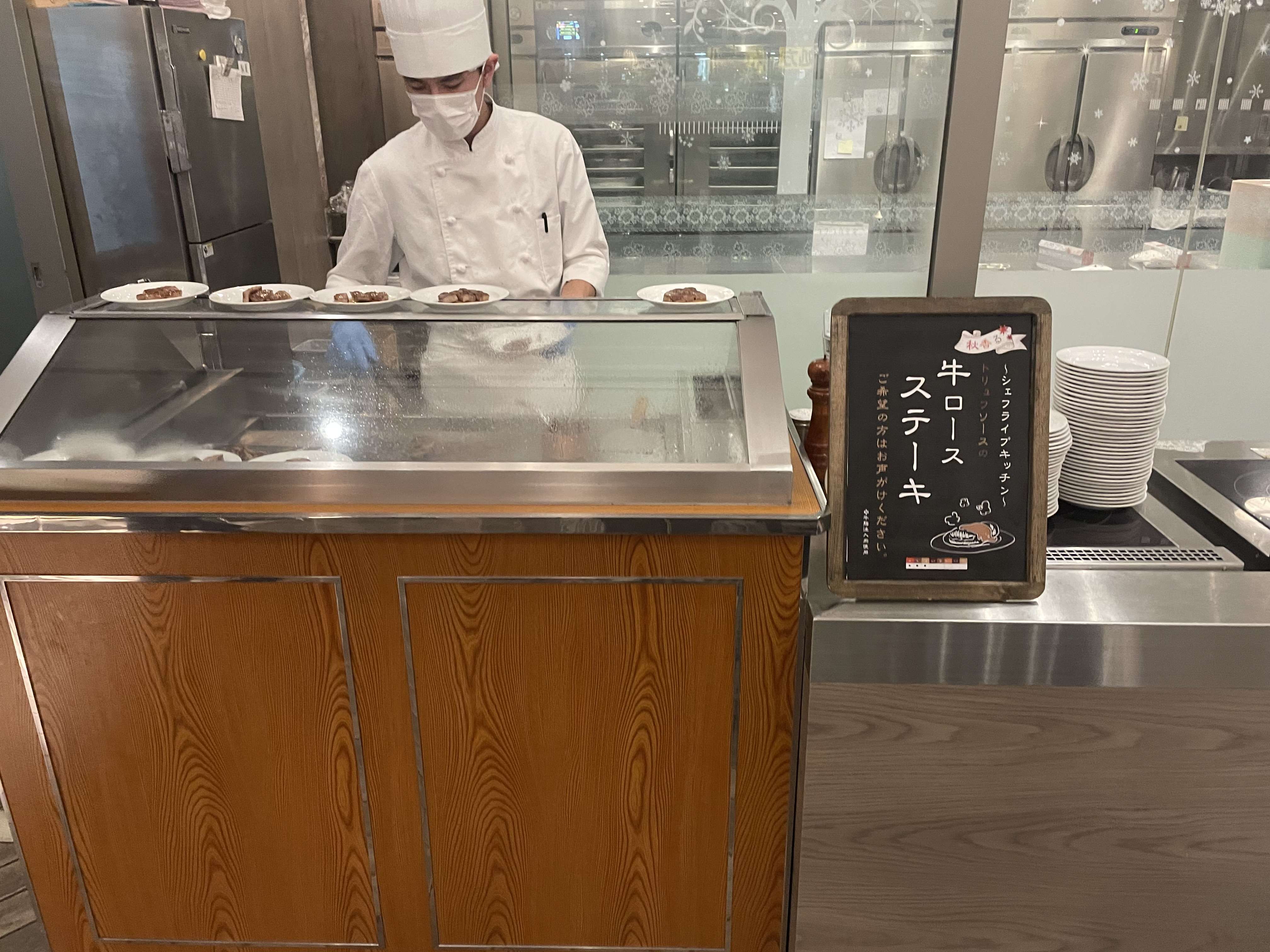 季節に合わせて変わるメニュー、たくさんの前菜から目の前で焼いてもらえるステーキ、スイーツも豊富で、手作りパフェコーナーもあります。