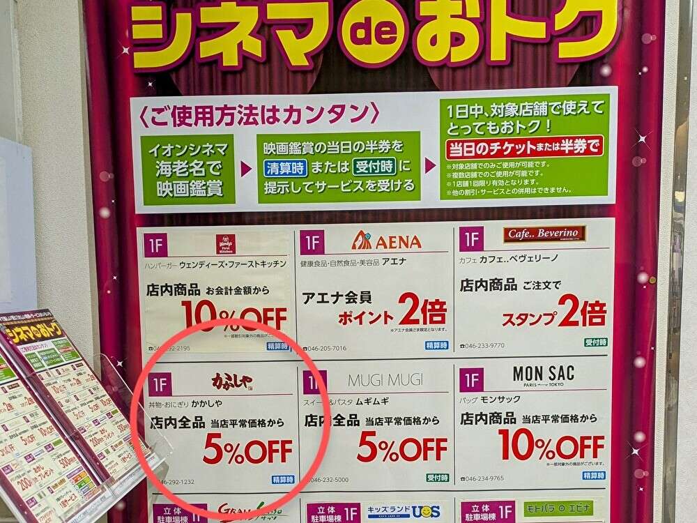 こちらの当日映画半券でお得なサービスが利用できるとのことで、今回、おむすび専門店「かかしや イオン海老名店」を利用することにしました。