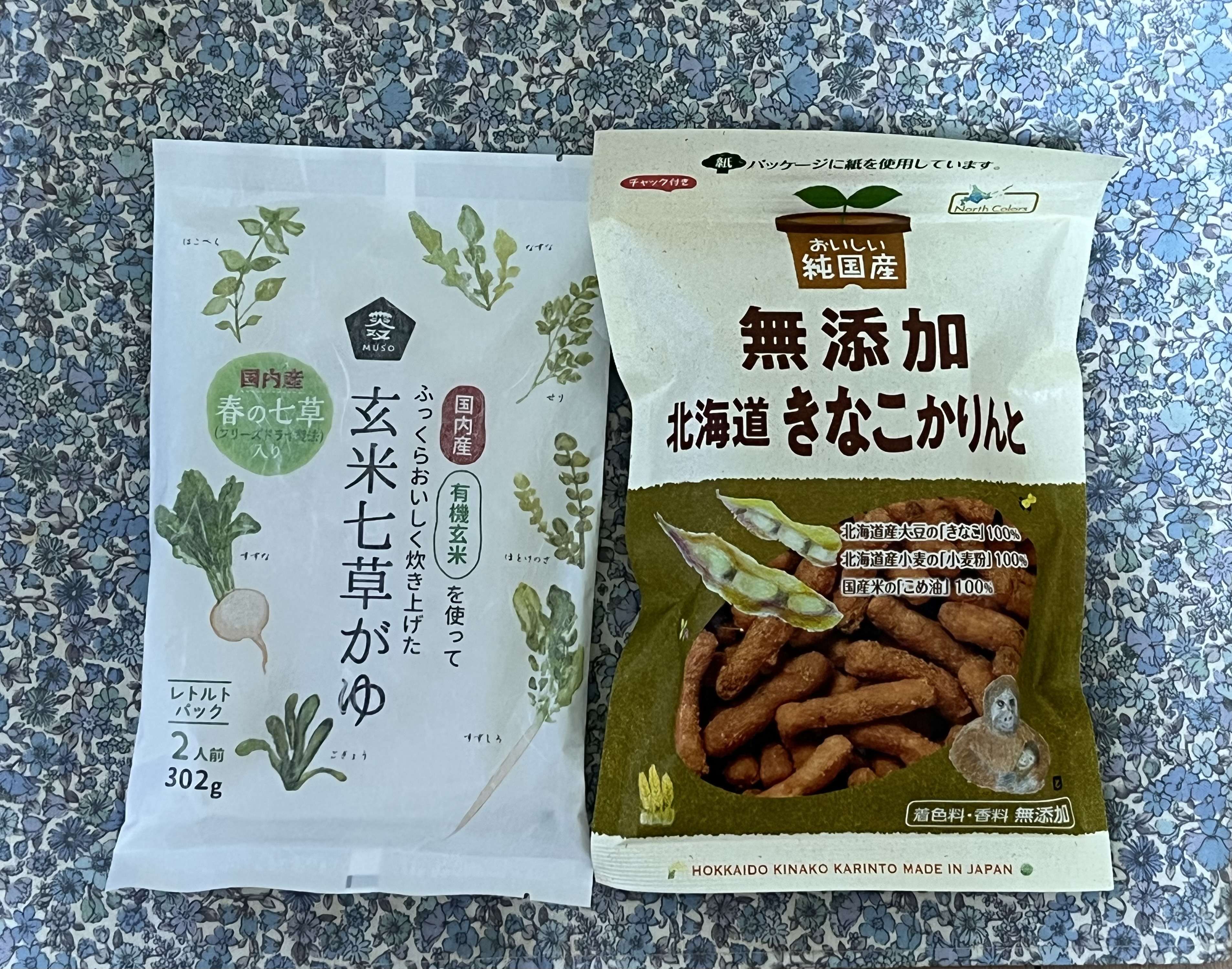 今回は、純国産「無添加北海道きなこかりんと」と、国内産有機玄米の七種がゆ(レトルトパック)を買いました。優しい味です。