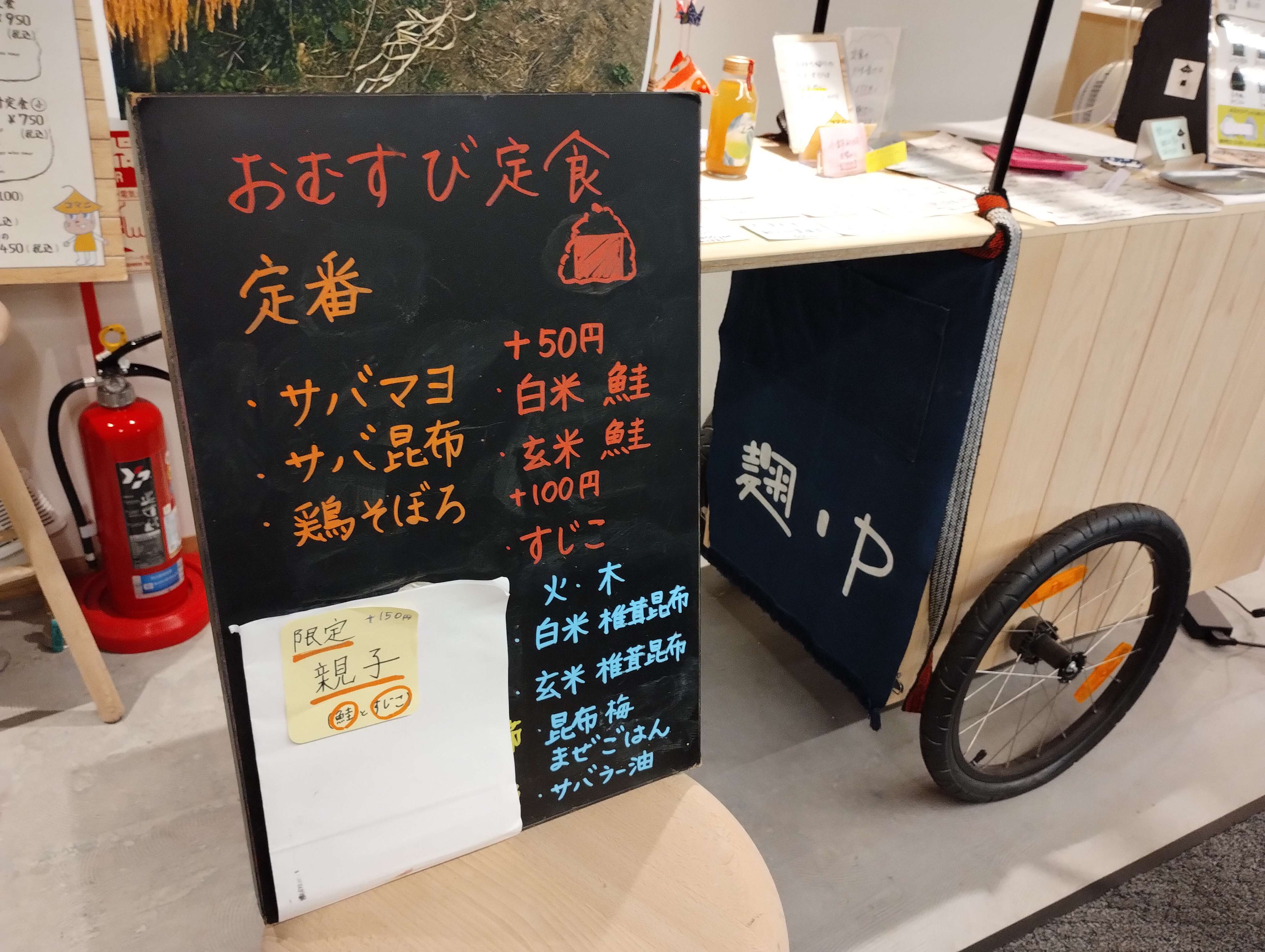おむすび定食は、おむすび1つに味噌汁、糠漬けで500円、おむすび2つで700円