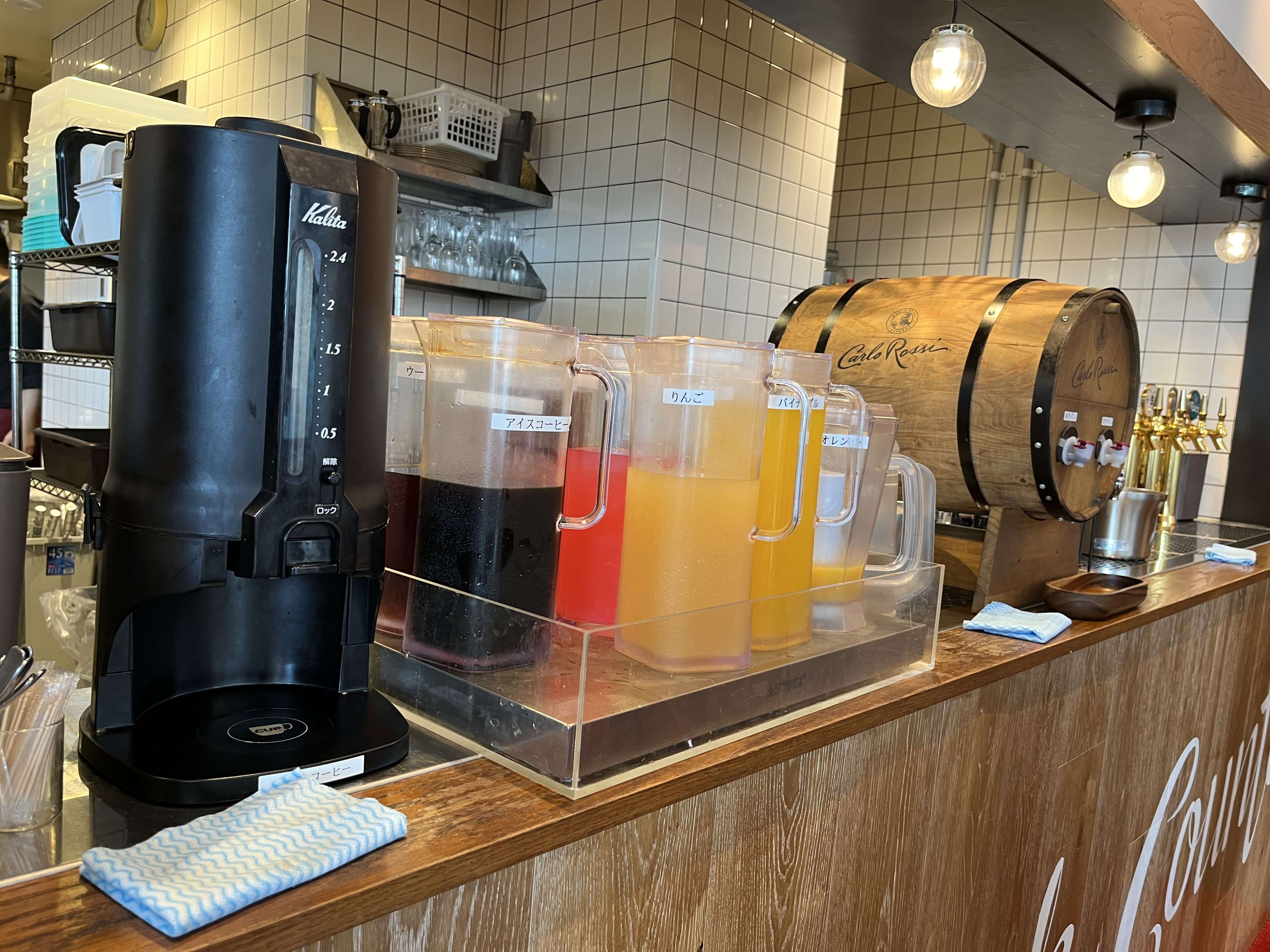 冷たいドリンクはりんご、オレンジ、パイナップル、グアバ、ウーロン茶、アイスコーヒーなど。ホットコーヒーも。色々なグラスが冷蔵庫で冷えていて嬉しい。
