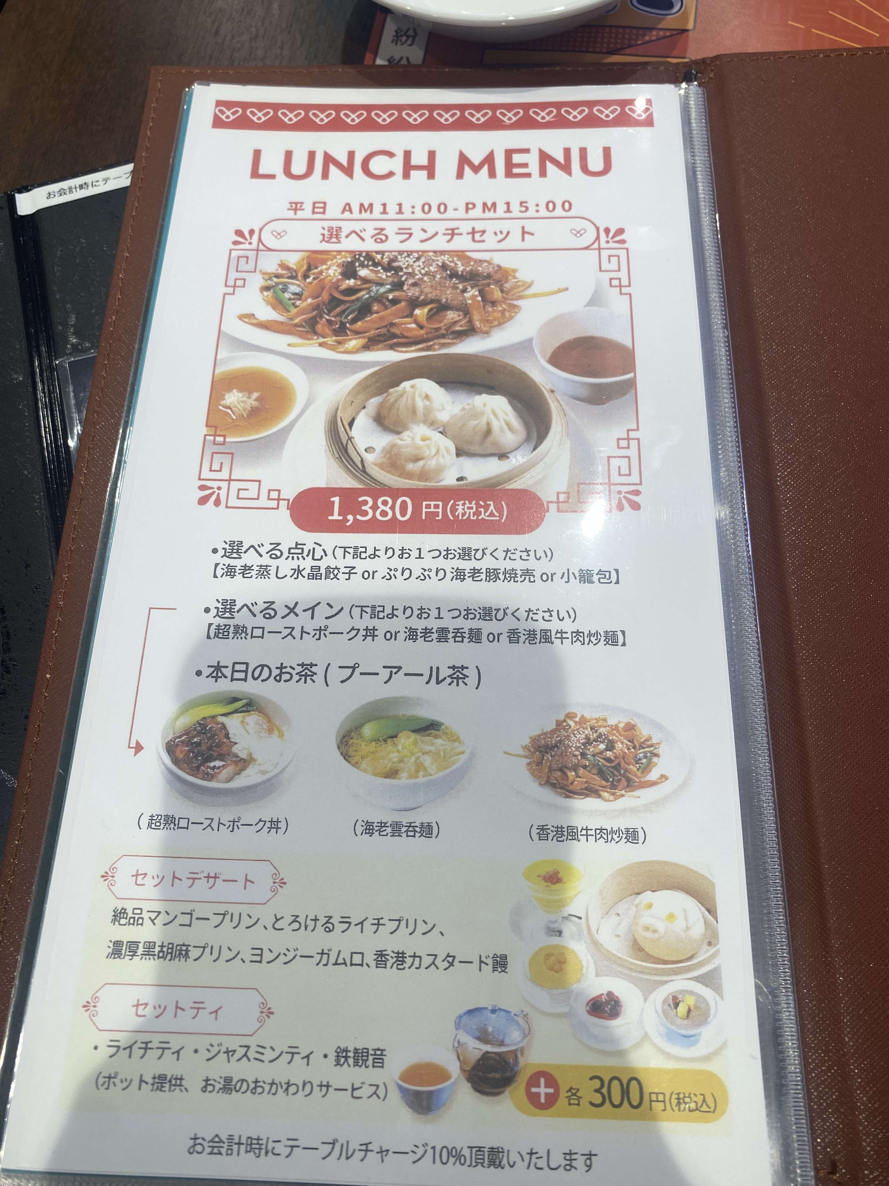 セットは飲茶3点、メイン3点から好きなものを1つずつ選ぶというもの。本日のお茶としてプーアール茶もいただけます。注文はQRコードを読み込んで自分のスマホでか注文する方式です。店員さんも多いので声をかければきてもらえます。海外のお店だからか店員さんも多国籍です。