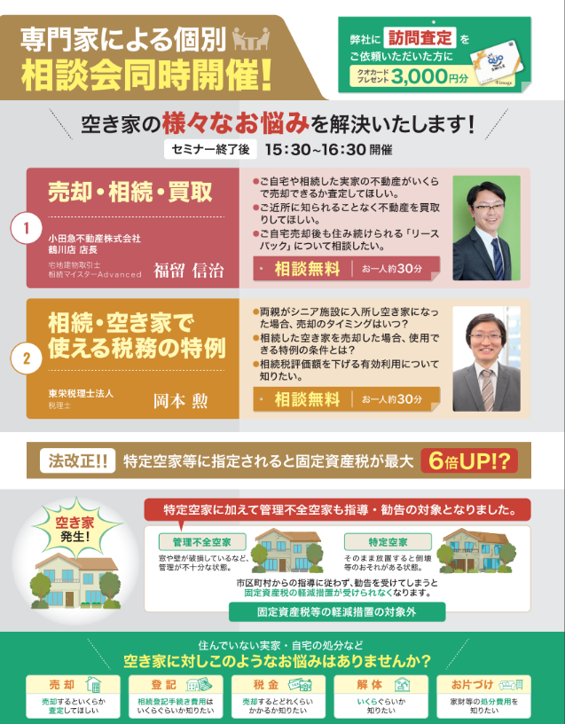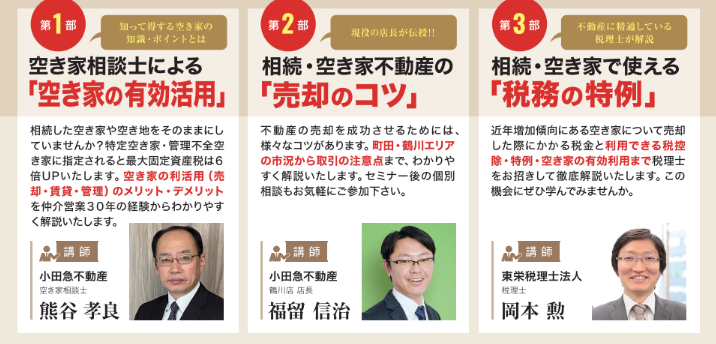 加えて、相続・空き家で使える「税務の特例」に関しても不動産に精通している税理士をお招きして徹底解説いたします。