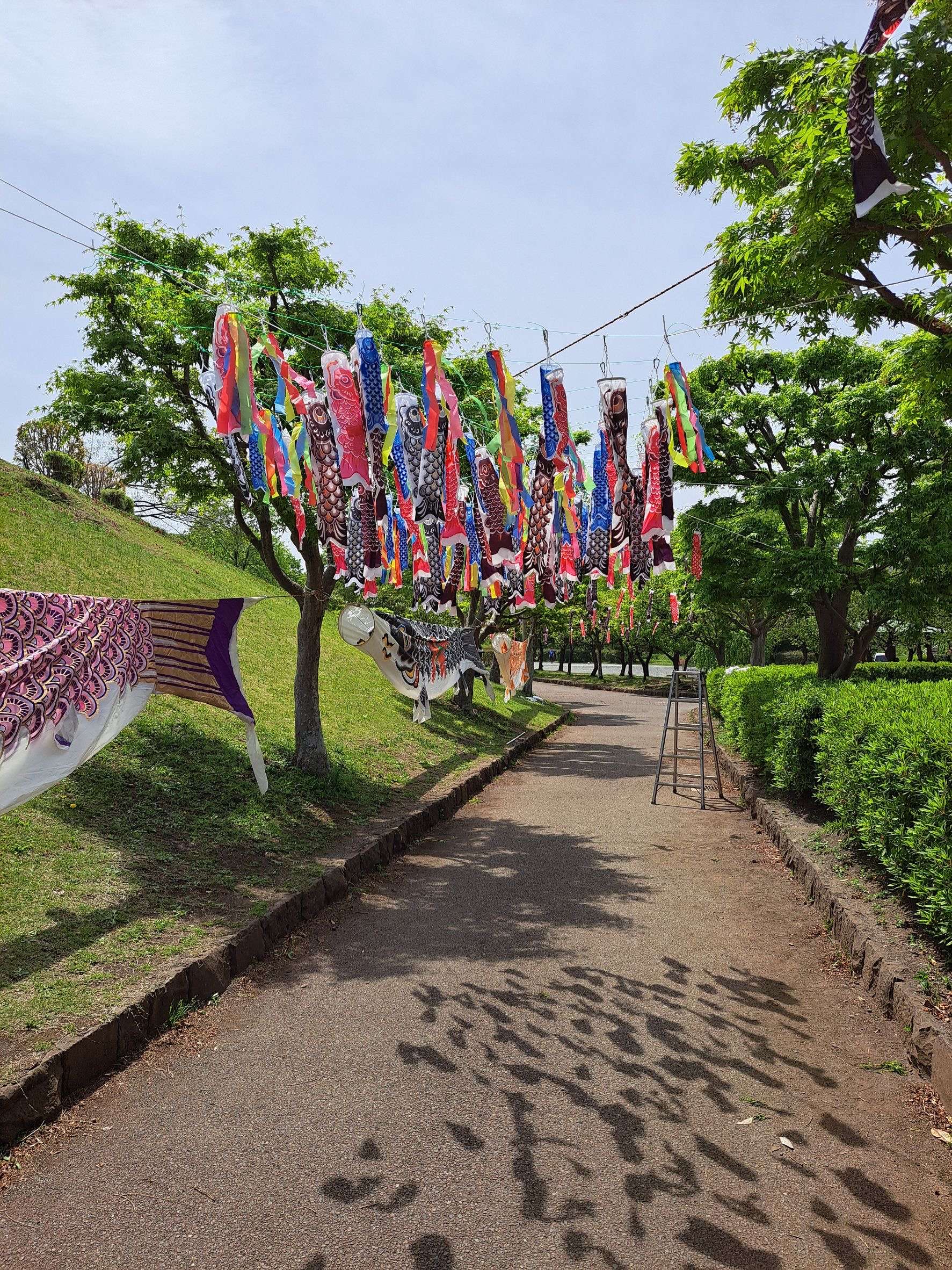 公園内の通路の上空に鯉のぼりたくさん飾られていてとてもカラフルです〜