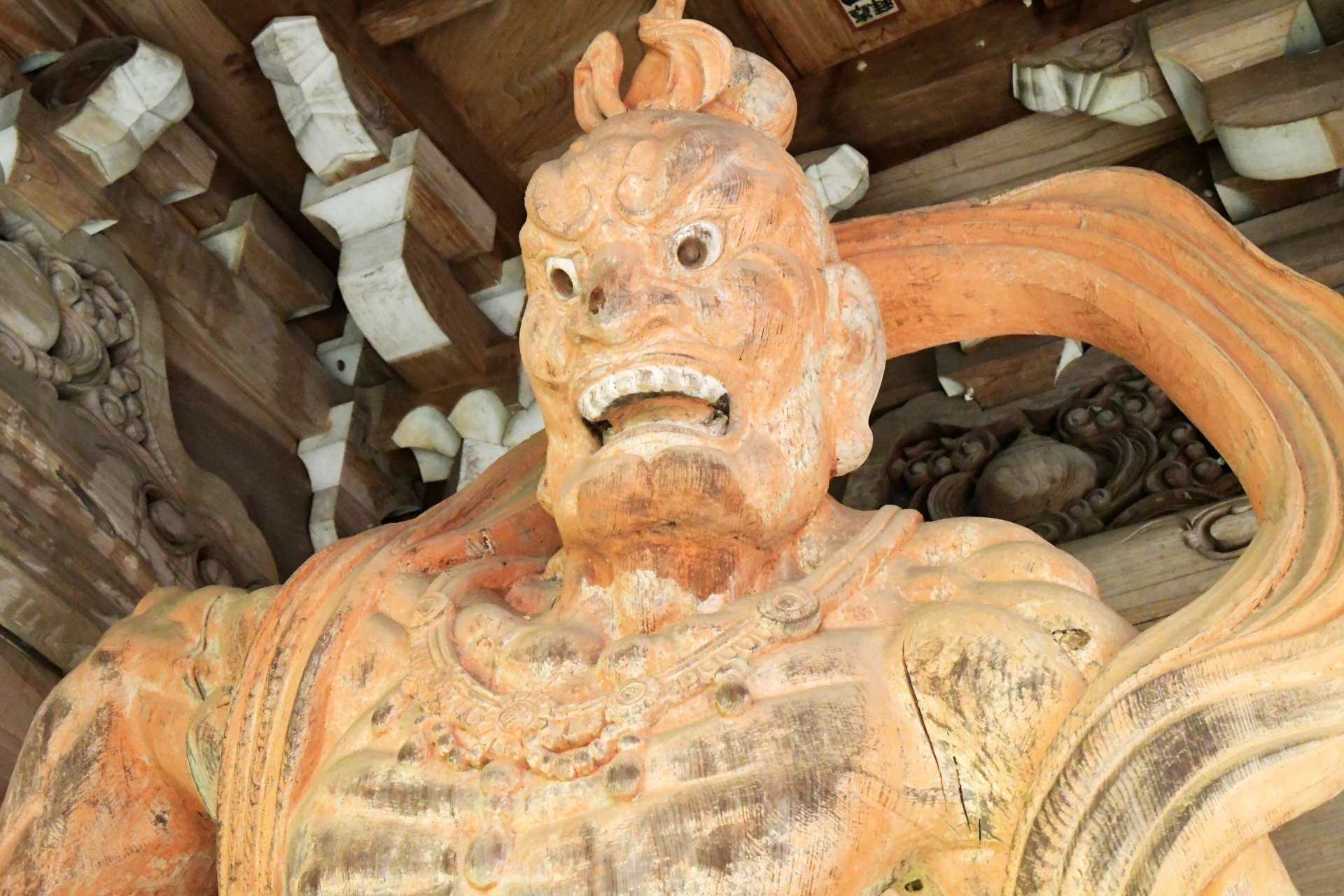入口には2体の迫力ある仁王像が置かれており、まるで山門を守っているかのような印象。山門の前の左側には半跏像(はんかぞう)の石仏や結界石が置かれています。また、山門をくぐった奥にある境内の五重塔の周りには、見事な七福神の像が置かれており、こちらも一見の価値があります。