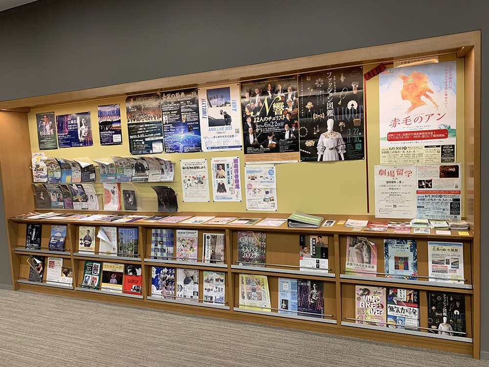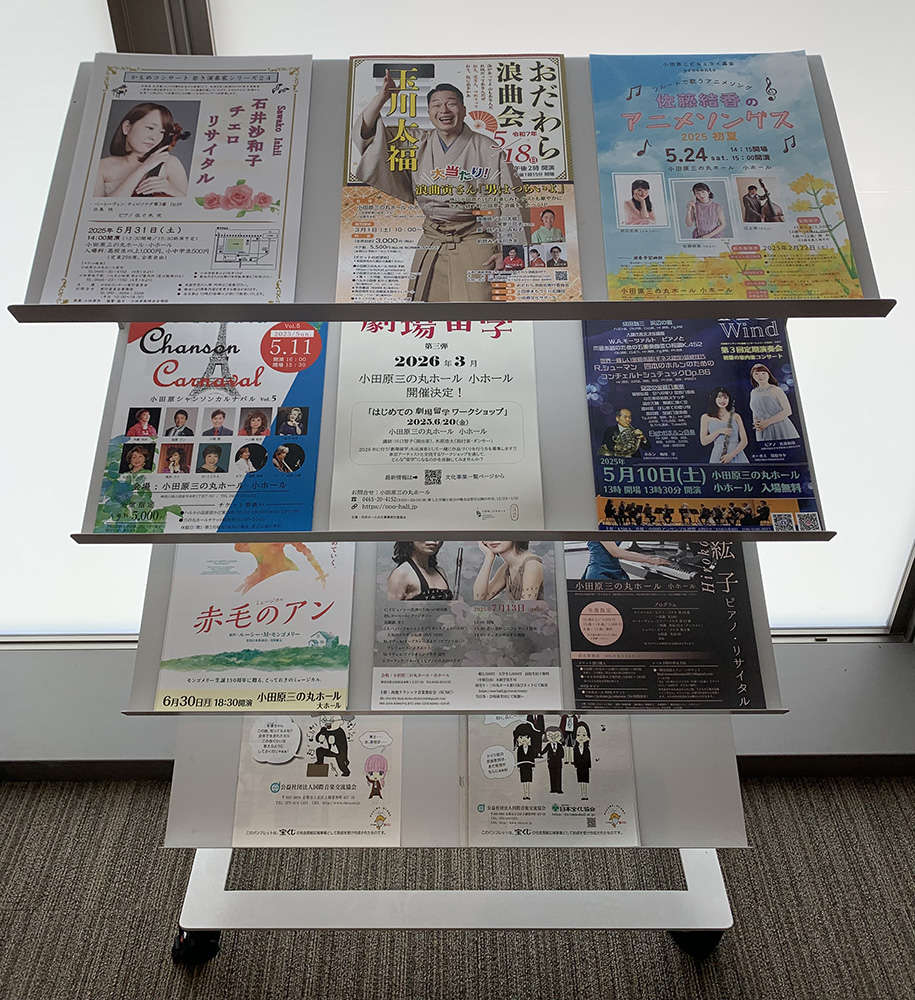 このホールの中には、三の丸ホールだけでなく、近隣の街で行われる文化芸術の催し物を紹介するチラシなどの情報が集められているスペースがあります。小田原で最も文化情報が手に入る場所、それが三の丸ホールです。小田原にやってくる人たちと同じように、小田原からもまた近隣の街に文化芸術を楽しみに出かけていくのも楽しいですね。皆さん、ぜひこちらの情報コーナーをご活用ください。