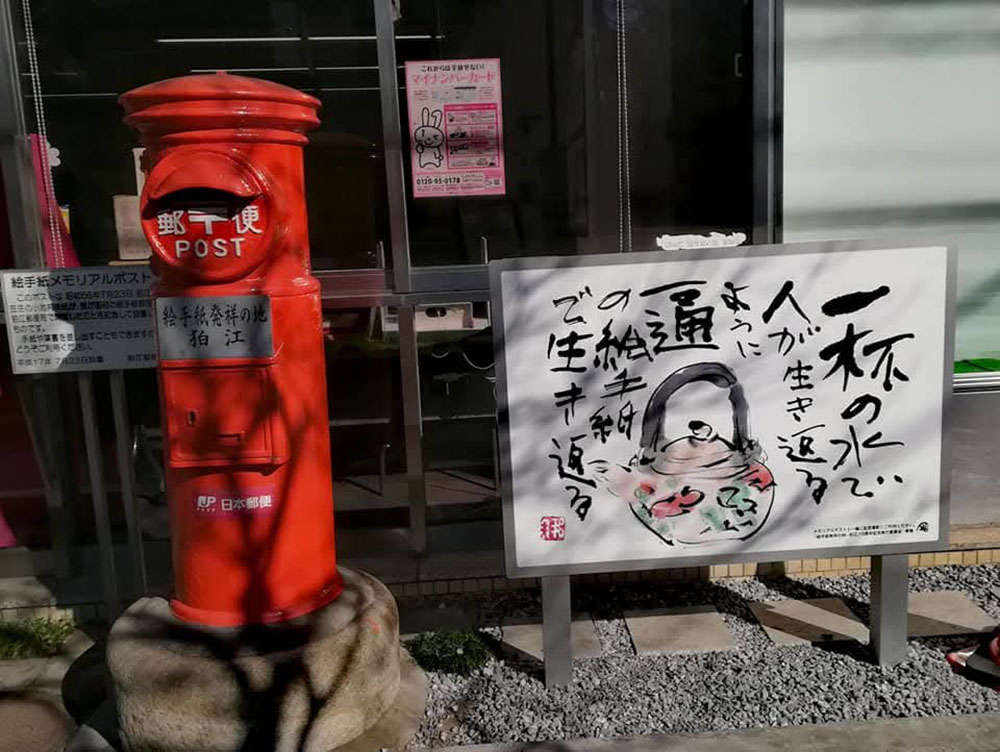 絵手紙発祥の地の狛江市では、市内全域を美術館とみたてて、いたるところに絵手紙を展示しています。