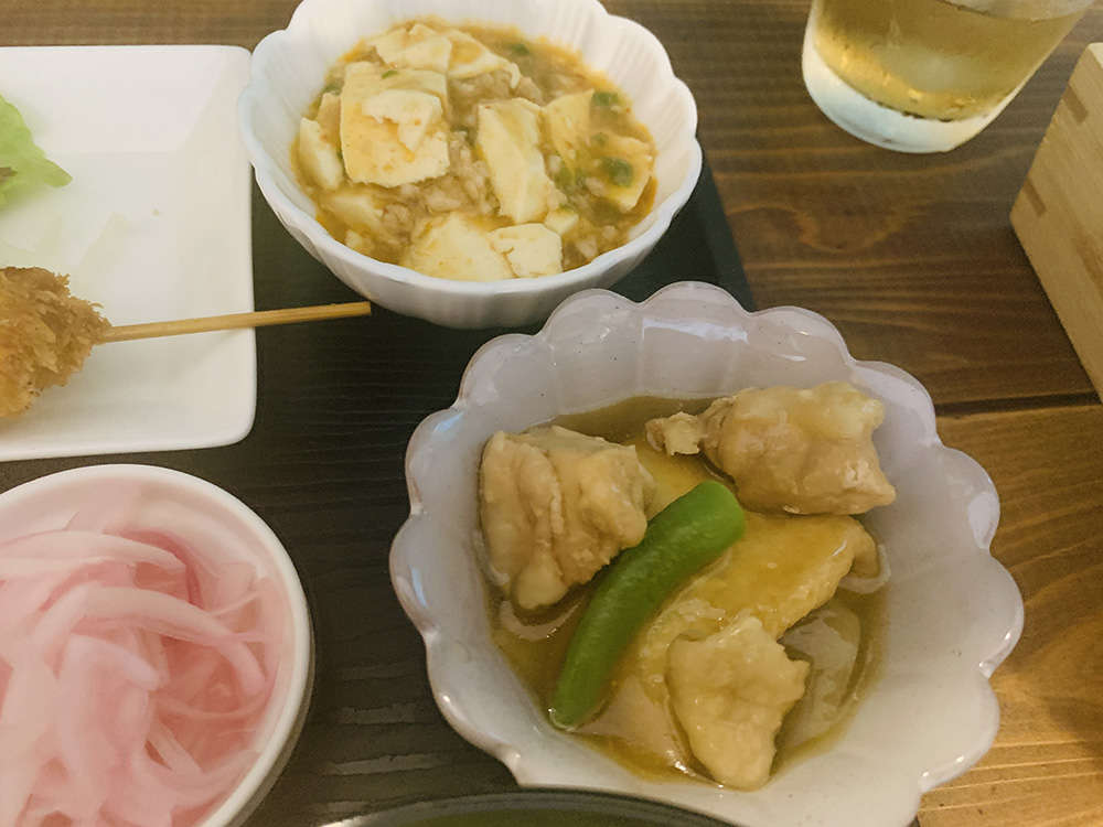 数々の小鉢が並んでいましたが、メインの料理は串カツのようです。