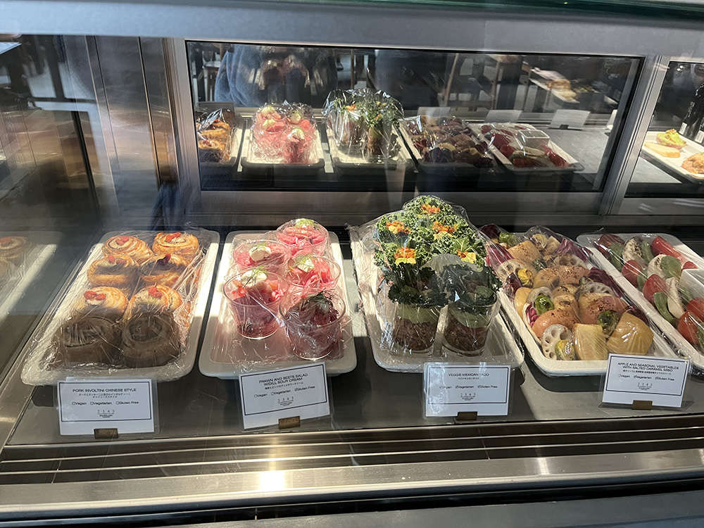 野菜をたっぷりと使った卵サンド、ピクルス付きとホットカフェオレ(737円税込)をオーダーしました。デリの野菜が何種類か入っていて満足しました。