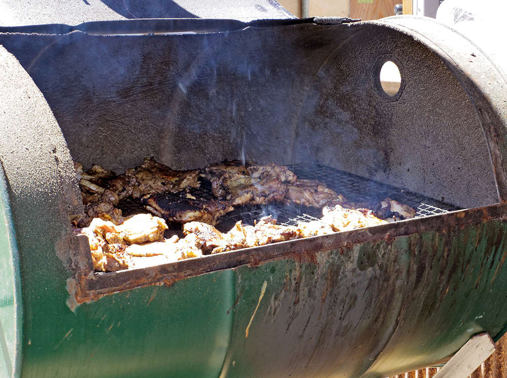 店頭のドラム缶でワイルドに焼き上げるジャークチキン。マッチョなお兄さんが焼いていました。