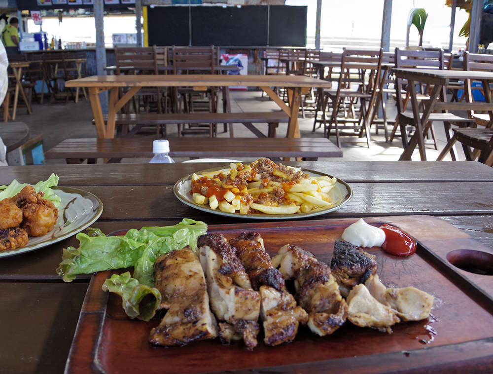 片瀬江ノ島駅から徒歩数分の西浜海水浴場。堤防に立ち並ぶテラス風の海の家にはそれぞれ美味しいものがあります。プレイジアースさんなら店頭で焼き上げるジャークチキンがおすすめ。今年はタコの唐揚げやメキシカンポテトも納得のおいしさでした。