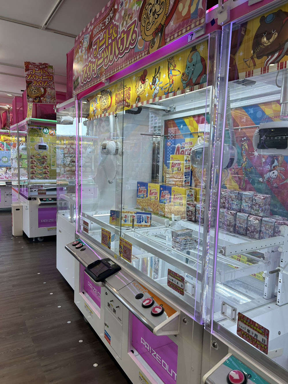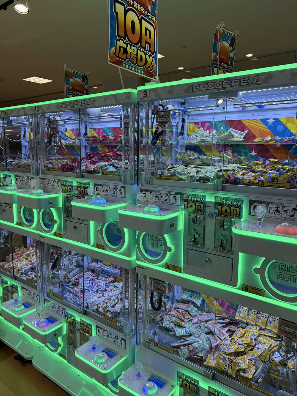 最近いろいろなゲームセンターで見かけることが増えた10円クレーンゲームの台も多数あり!
