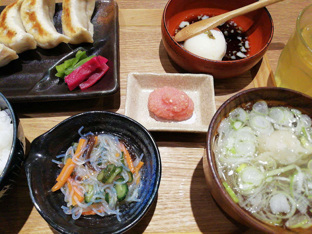 餃子の他に小鉢や温泉卵、スープに、明太子まで