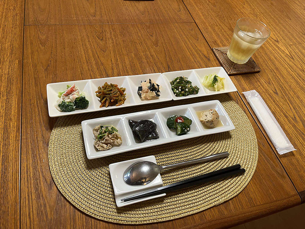 ブロッコリーとカニカマ、カレー味のきんぴら、タラモサラダ、オクラ、野菜、豚しゃぶ、ナスの煮浸し、きゅうり、がんも煮