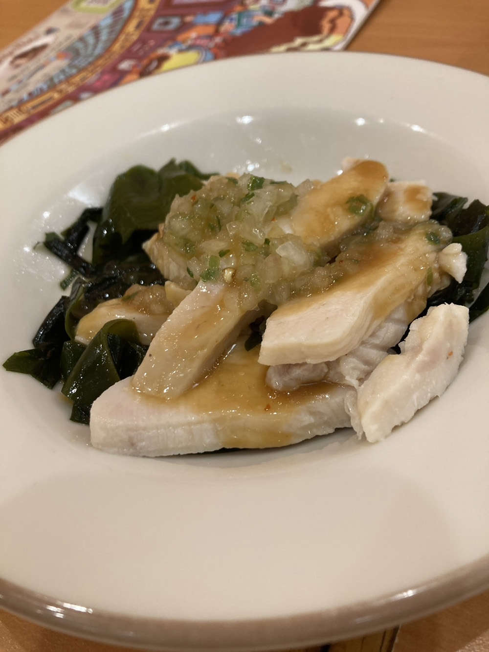 鶏肉がしっとり柔らかくて、ネギがたくさんかかっていて下にはワカメがあり、一緒に食べるのが合います。