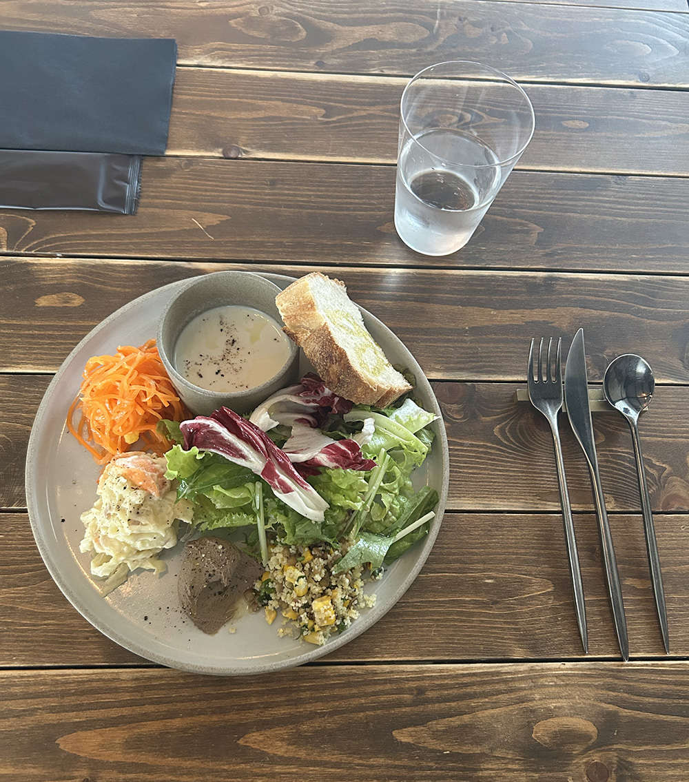 この日のランチプレートは、スープにキャロットラペ、クスクスやレバームース、サラダなど、どれも丁寧に仕上げられていて、ワインが欲しくなるような大人の前菜盛り合わせといった感じ。バゲットも美味しかったです。