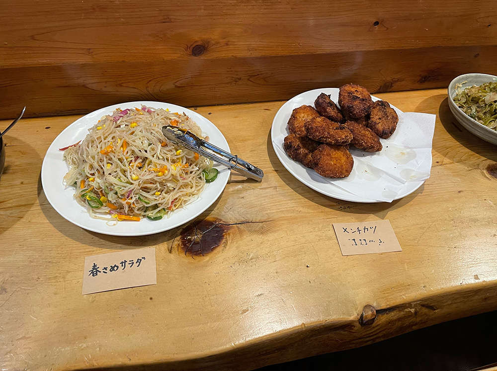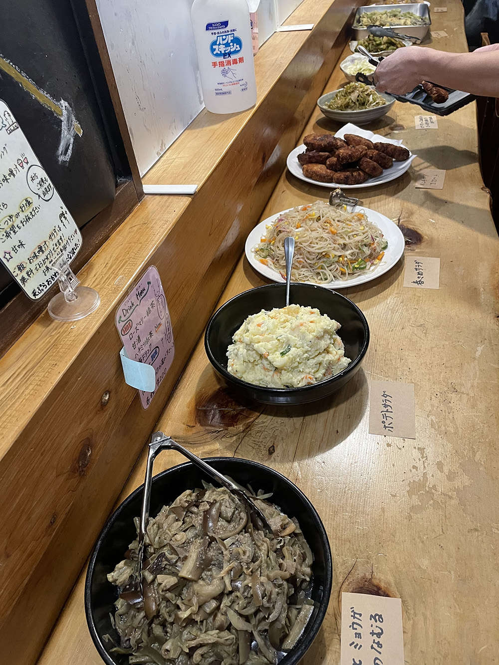 まずはお弁当箱を待ちます。蓋が閉まればオッケー、他にはルールなし。たくさんの手作り惣菜、メンチカツ、天ぷら、春雨サラダ、煮物、枝豆ご飯など。