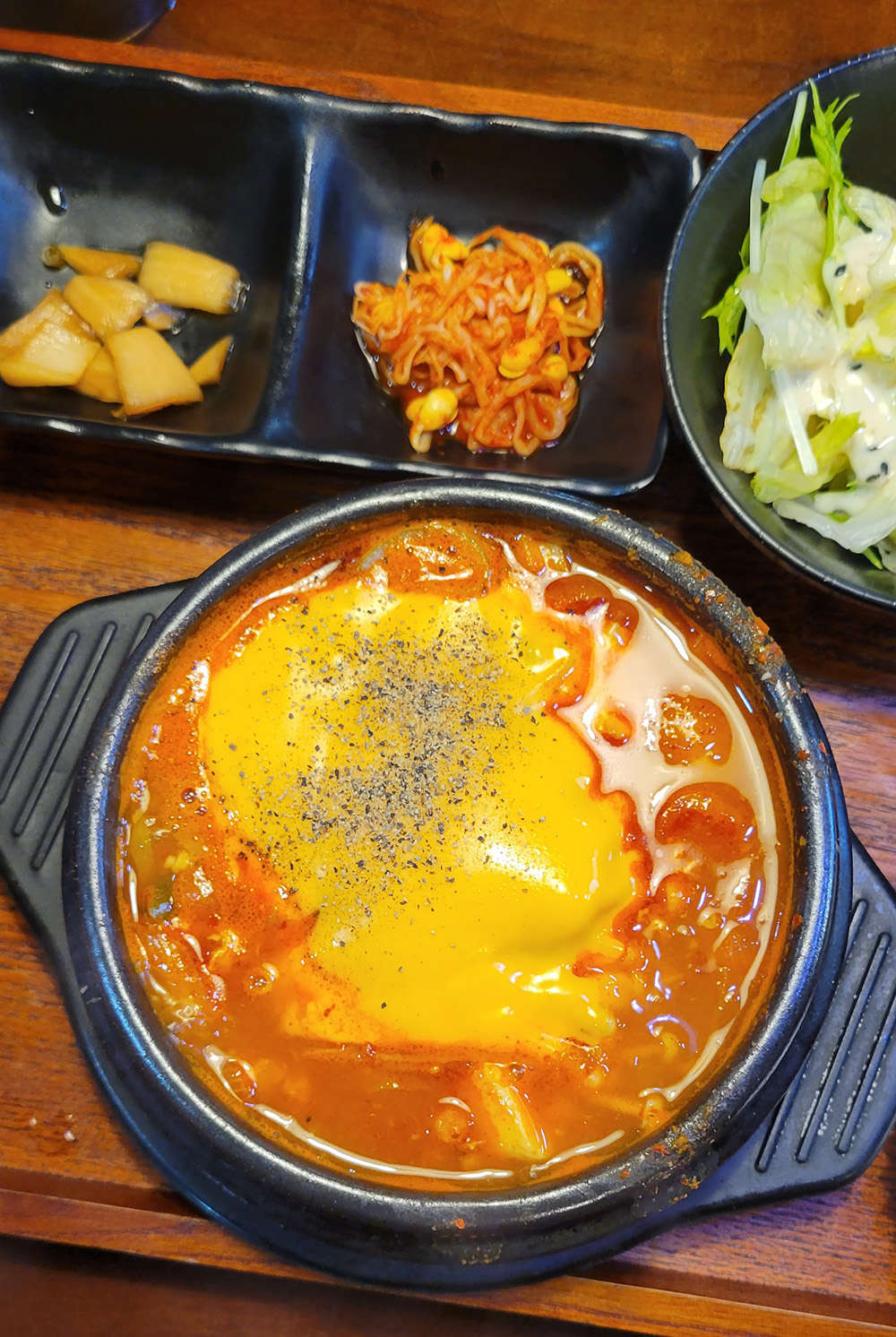 スンドゥブはさっぱりした辛さでチーズ入りを選ぶとよりマイルドに食べられます。