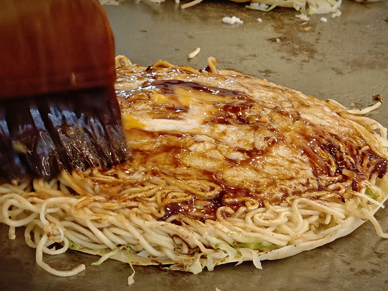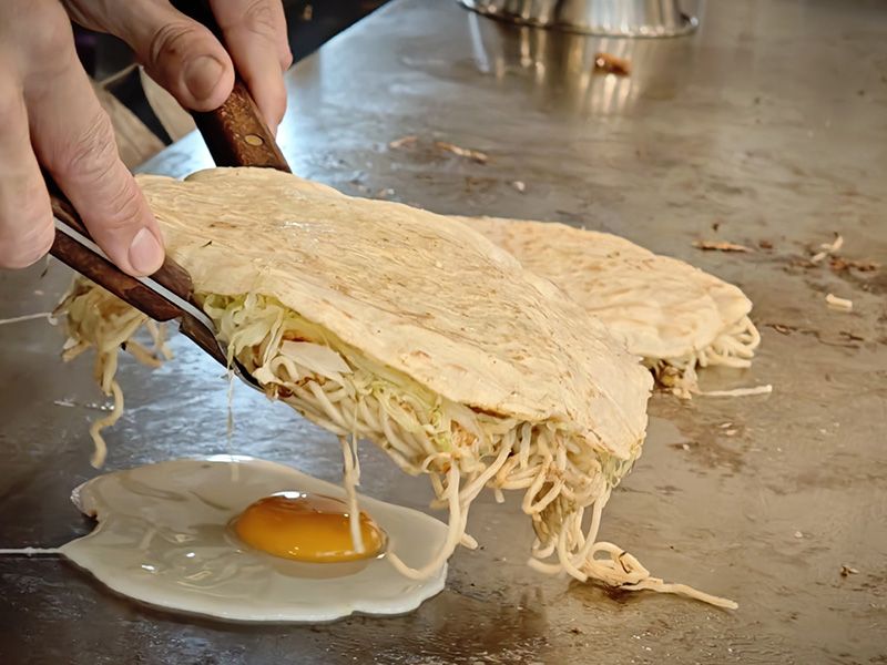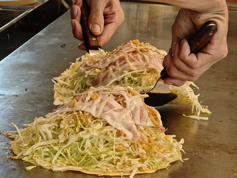 山盛りのキャベツが中に入って、以前広島に住んでいたときによく食べたお好み焼きそのもの!