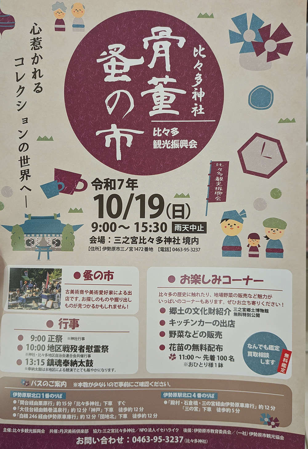 今年も伊勢原市にある比々多神社の境内で、骨董蚤の市が開催される予定です。