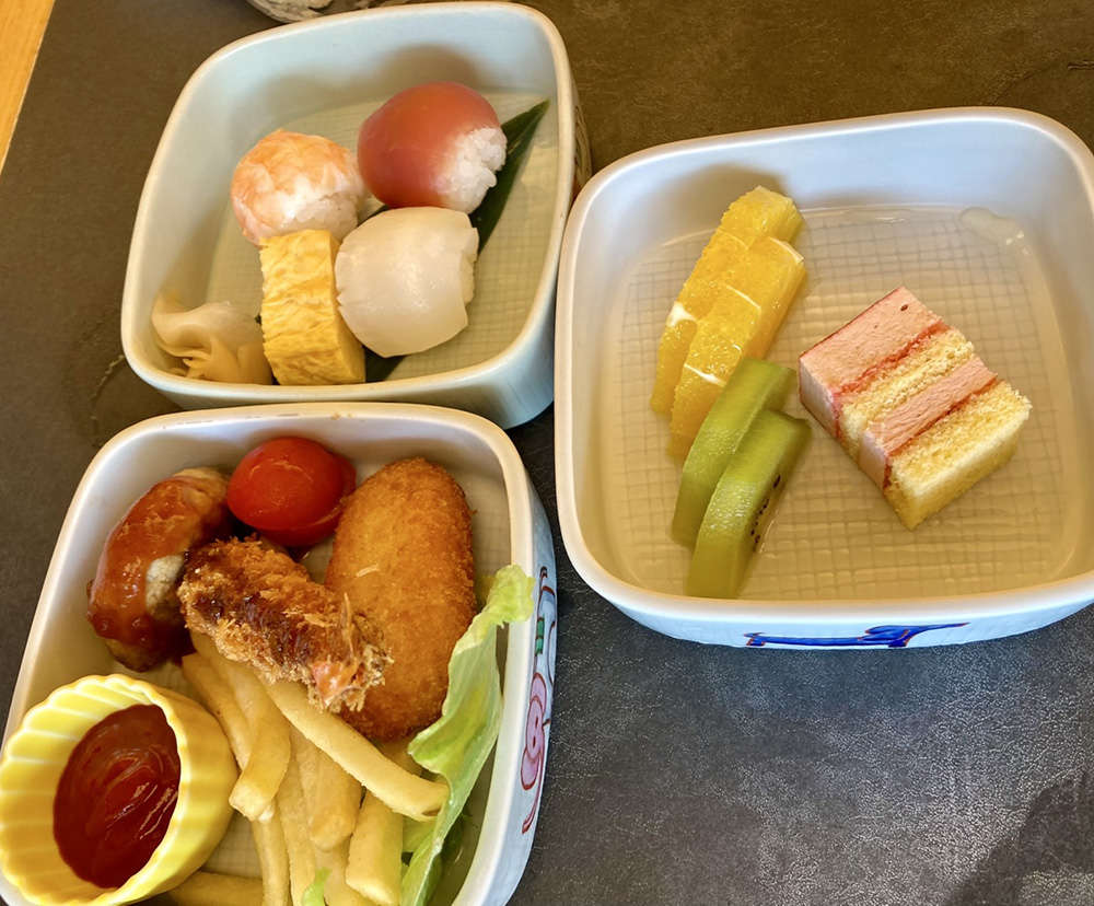 ジュース(オレンジまたはリンゴ)、ハンバーグ、海老フライ、ポテトフライ、手毬寿司、デザート
