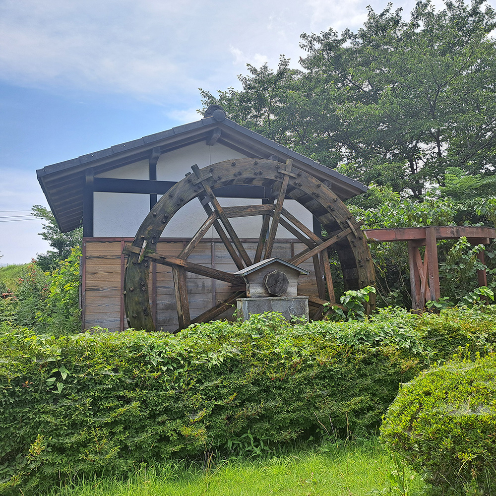 ガッタンゴットンと回る水車、それを使って作る美味しい蕎麦屋さんがあります。