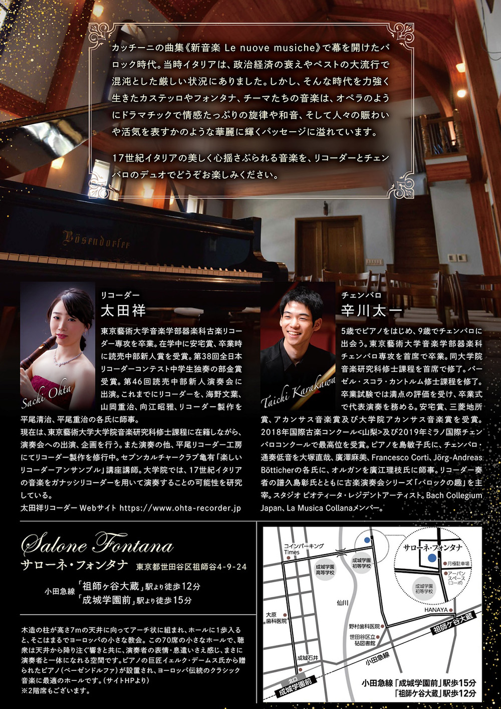 来月10月19日(日)に、世田谷の素敵なサロンホールで、ルネサンス・リコーダーとチェンバロが奏でるイタリア初期バロックの演奏会をご用意いたしました。