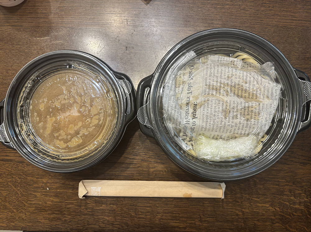 麺もスープも温かいまま、自宅で九六のつけ麺をいただくことができました。麺もスープも愛情たっぷりの味、チャーシューはほろほろです。ネギ付き。こぼれないよう蓋付き容器に入れて持たせてくれます。常温と冷凍のものがあるそうです。用途にあわせてどうぞ。