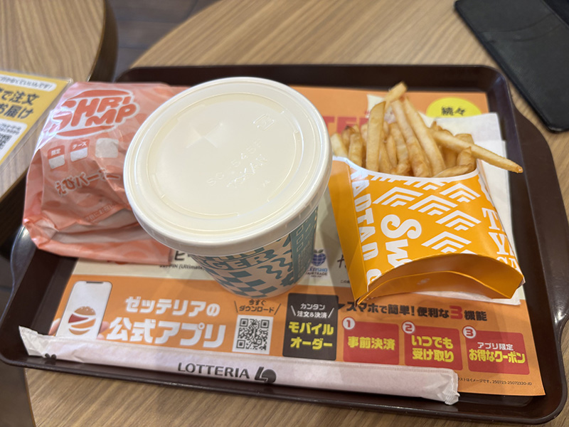 改札の真下にあるロッテリアは電車を間近で見ることができるお席があります。ロッテリアといえばエビバーガー、ランチセットのドリンクにシェイクも選べます。店内ひろびろ、いろんな年齢層のお客さんがいました。