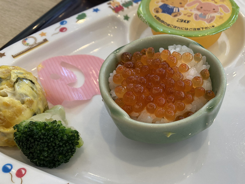 おうどん、ひとくちいくら丼、ブロッコリー、かぼちゃサラダ、ゼリー、ジュース、おもちゃ付きです。