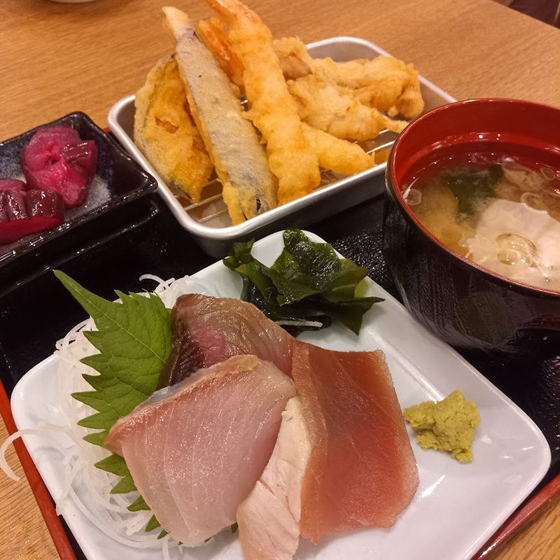 つまみは刺身&天ぷら定食を、ご飯抜きで。