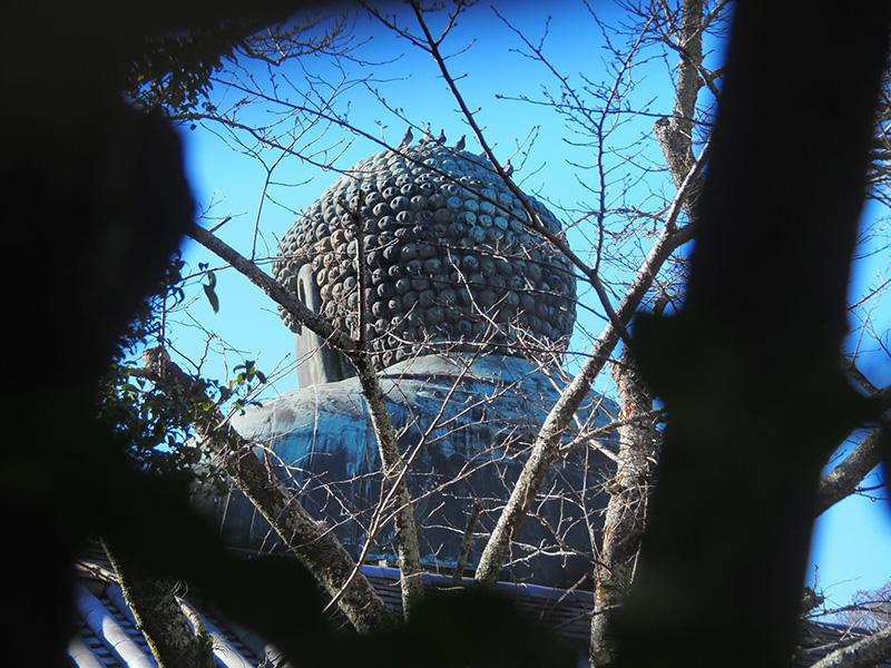 秋冬の時期、高徳院を取り囲む生垣の落葉具合によっては、大仏様の横顔や後頭部を外の道路越しに拝見できる場合があります。