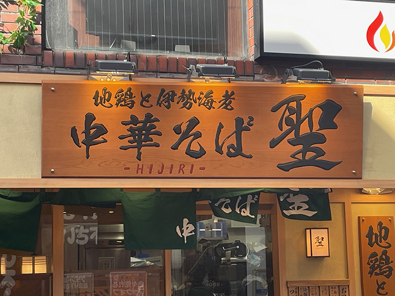 店の入り口に飾られた誰でも一目で分かる大きな「地鶏と伊勢海老 中華そば聖-HIJIRI-」の看板。