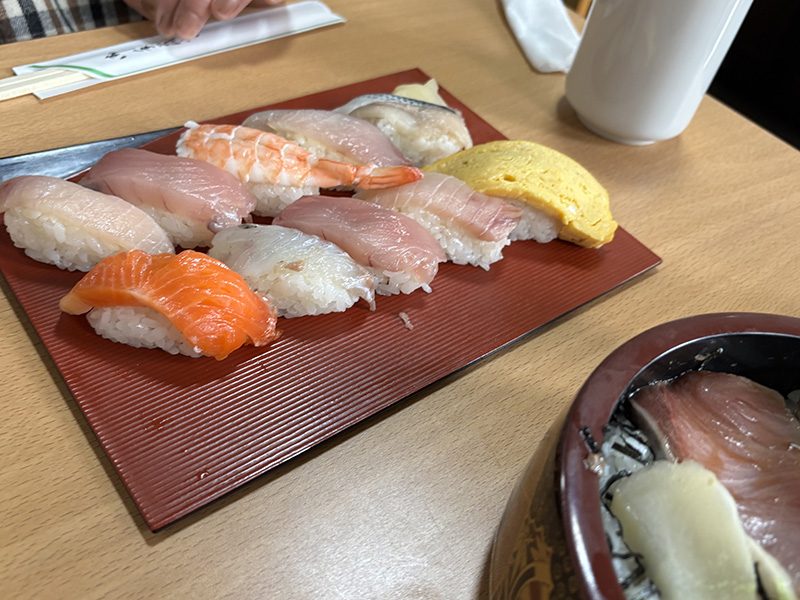 3人での訪問でしたが、それぞれに一品注文と別で二品を頼んでシェア。中落ち丼とブリ丼、さらににぎりでしたが、とても500円で提供されるのが信じられないくらい美味しい! お椀もあら汁。出汁に舌鼓。