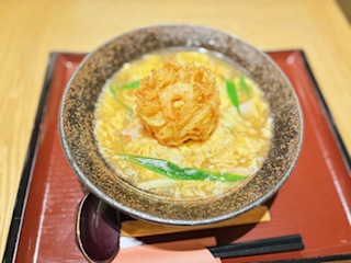 かき揚げをスープに浸して食べると、トロトロになってまた美味しい。