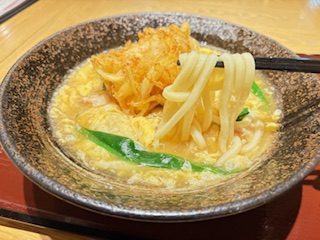 かき卵が入ったスープは優しい味、お出汁がしっかり利いて、うどんによくからんで美味しい。