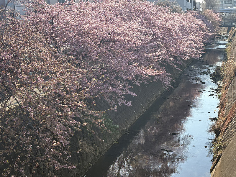 今年の満開はいつかな、生田・五反田川の河津桜並木