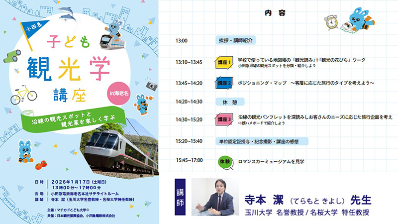 2026年1月17日(土)、マチカドこども大学®特別回『小田急子ども観光学講座』を小田急電鉄海老名本社&ロマンスカーミュージアムで開催いたしました。本企画は、社団法人日本観光振興協会と小田急電鉄およびマチカドこども大学®の連携により企画・運営したもので、玉川大学名誉教授・名桜大学特任教授 寺本潔氏を講師に迎え、小田急沿線の観光スポットを学び、沿線の観光とそれを支える観光産業についての理解を子どもたちに深めてもらうために実施したものです。