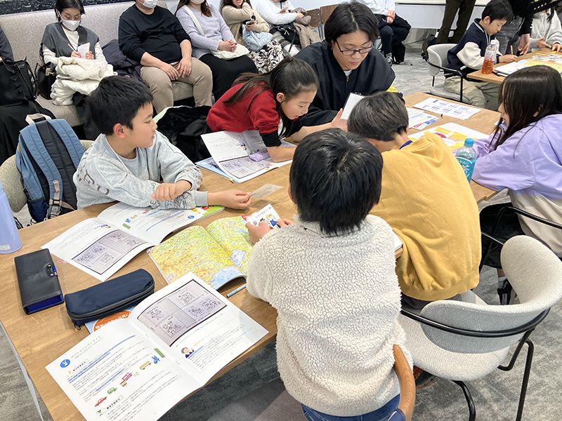 講座では6つのグループに分かれ、グループ単位でワークに取り組みました。初対面の子どもたちで編成されたグループでも円滑に進行できるよう、各グループに1名ずつ多摩大学の学生がサポート役として参加。大学生が子どもたちが楽しく参加できるようサポートしたり、意見を整理したりする役割を担いました。これもマチカドこども大学®の特徴のひとつで年齢の近い存在として大学生が関わることで、子どもたちは安心して楽しく参加できていました。