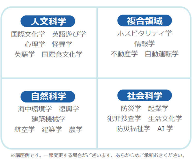 講座ジャンルは人文科学、自然科学、社会科学、複合領域に分類され、「自動運転学」「国際食文化学」「海中環境学」「犯罪捜査学」など多様な講座を展開しています。