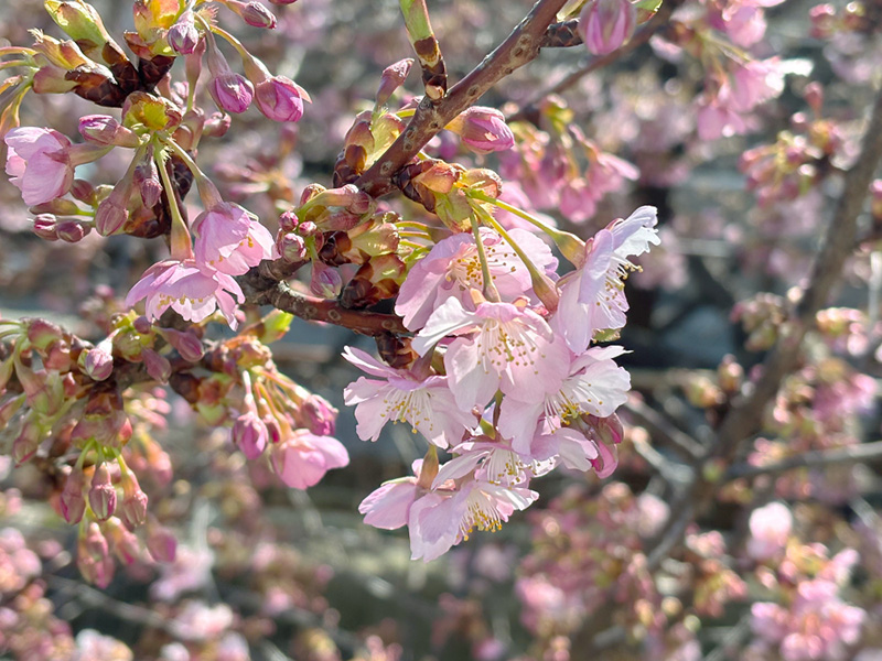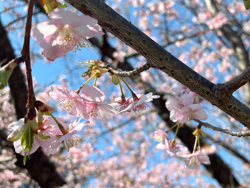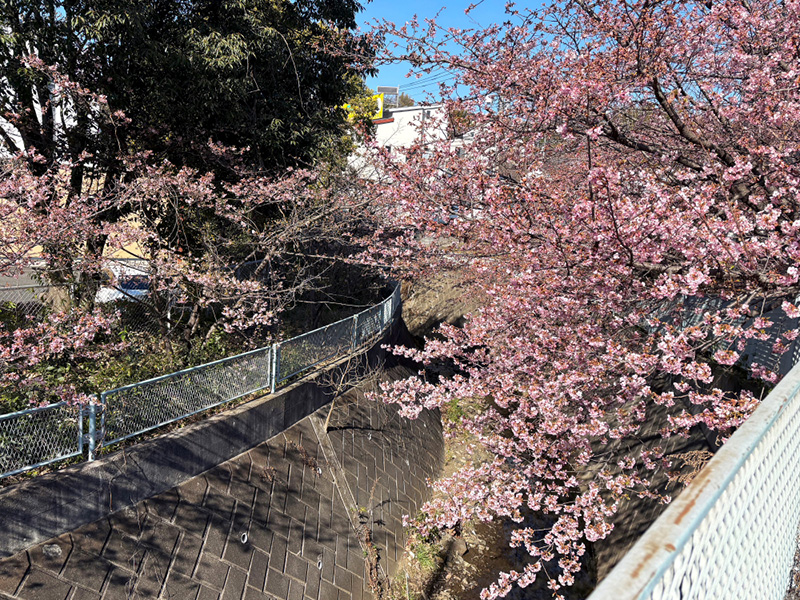 あまり知られていないかもしれませんが、世田谷通りの栗谷入り口から読売ランド駅へ向かって五反田川沿いに河津桜が咲いています。ピンクの花がとても綺麗で小鳥たちもさえずっていました。