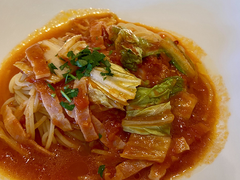 パスタはちゃんとアルデンテですが、モチっとした歯応えで、ソースがよく絡みます。ベーコンとお野菜たっぷりのトマトソース。ニンニクも効いていて、量も十分です。