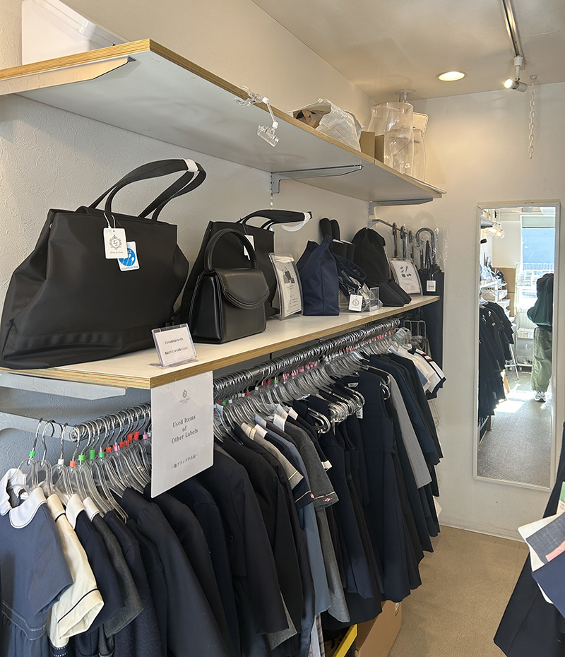 こちらはお受験コーナー。お子さま用のフォーマルウェアはもちろん、お母さま向けのバッグや小物類もそろっています。落ち着いたデザインや上品な素材感のアイテムが多く、特別な日にも安心して選べるラインナップ。古着と新品の両方があり、状態の良いものが多いのも印象的です。購入だけでなく、役目を終えたアイテムの買取相談ができるのも心強いポイント。行事が多い時期の、頼れるコーナーです。