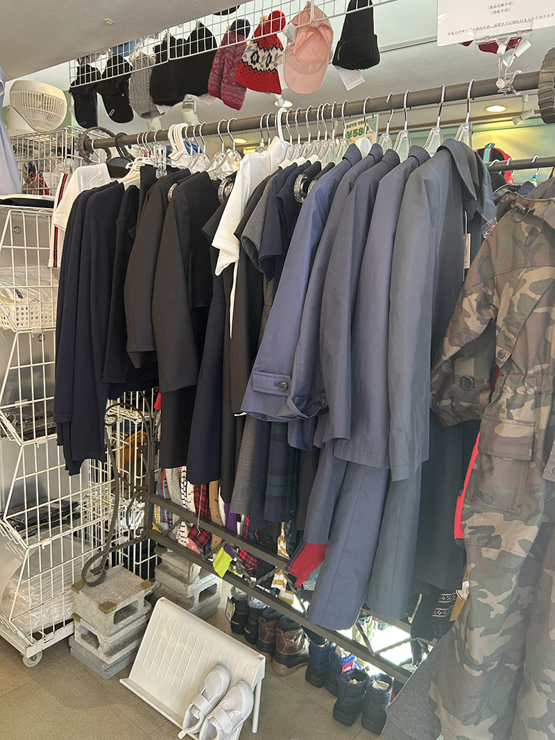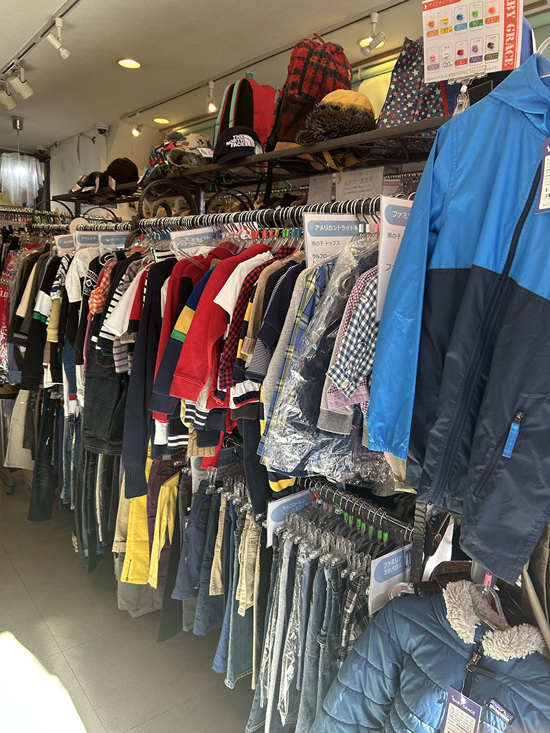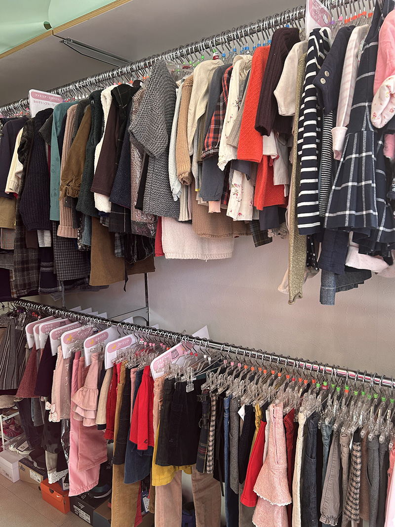 こちらは普段着のお洋服コーナー。毎日の通園やお出かけに使いやすいカジュアルな子ども服がずらりと並びます。サイズや季節ごとに見やすく、じっくり選べるのも嬉しいところ。状態の良い古着や、まだ新しいアイテムも多く、「これ、また着せたいな」と思える服に出会えます。着なくなったお洋服を買取に出して、次の一着を探す、そんな循環が自然に生まれる場所です。