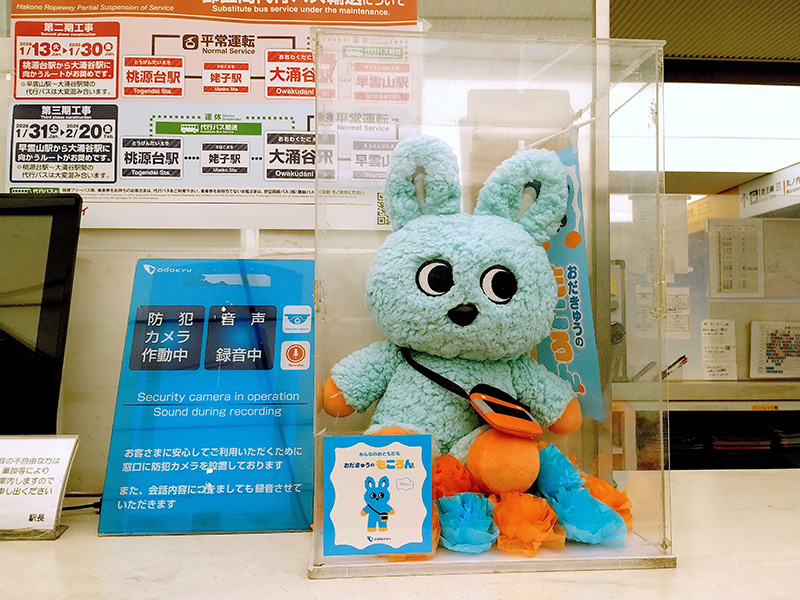 「もころん」は地下改札口のカウンター上に座り、駅員とともに乗降客を見続けていました。そして他改札口にも複数の「もころん」がいました。グッズも一緒に展示してあります。