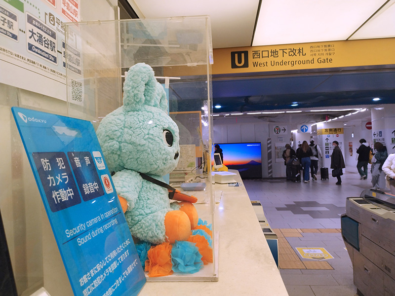 新宿駅西口地区では再開発が進み、JR地下西口改札口では広場も整備され、周辺の景観が一新されつつあります。小田急線の改札口も改装を前にシャッターや工事フェンスで囲まれています。その中で、もころんに会えず改札口を後にしようとした時、すぐ近くに佇む青い影が目に留まりました。