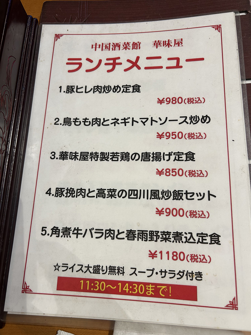 中国酒菜館 華味屋 は小田急線・経堂駅から歩いて約8分ほど、すずらん通り沿いにある地域に愛される中華料理店です。ランチタイムには定番の中華メニューが揃い、気取らない雰囲気の中で、心もお腹も満たされるおいしい料理が楽しめます。地元のひとりランチや家族での食事にもぴったりな、あたたかい空気の流れるお店です。