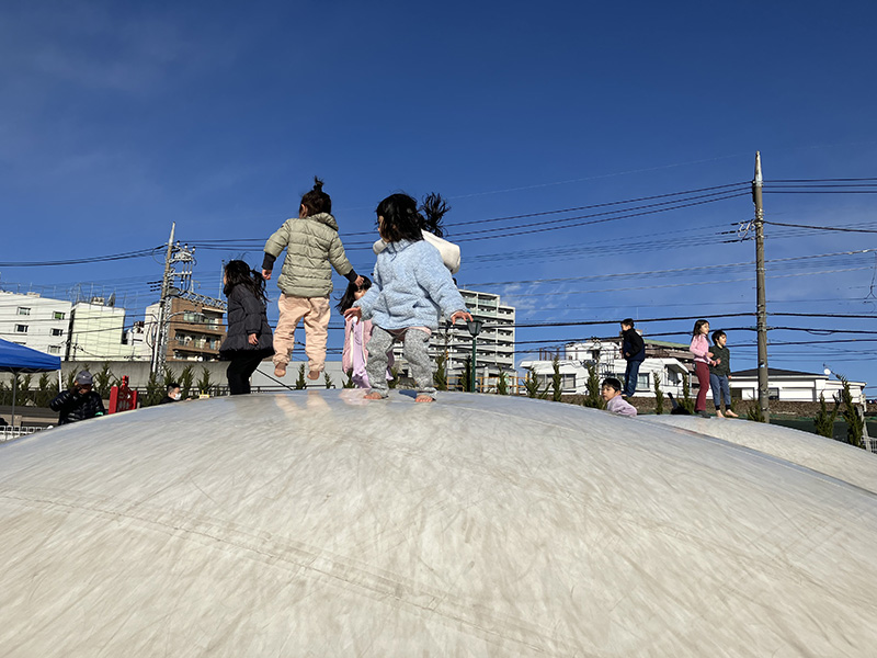 ユニバーサルデザインのインクルーシブ遊具があり、ブランコは順番待ちの列ができていました。ふわふわドームは1番人気で、時間制の入れ替えになっていて、係の人が管理してくれています。