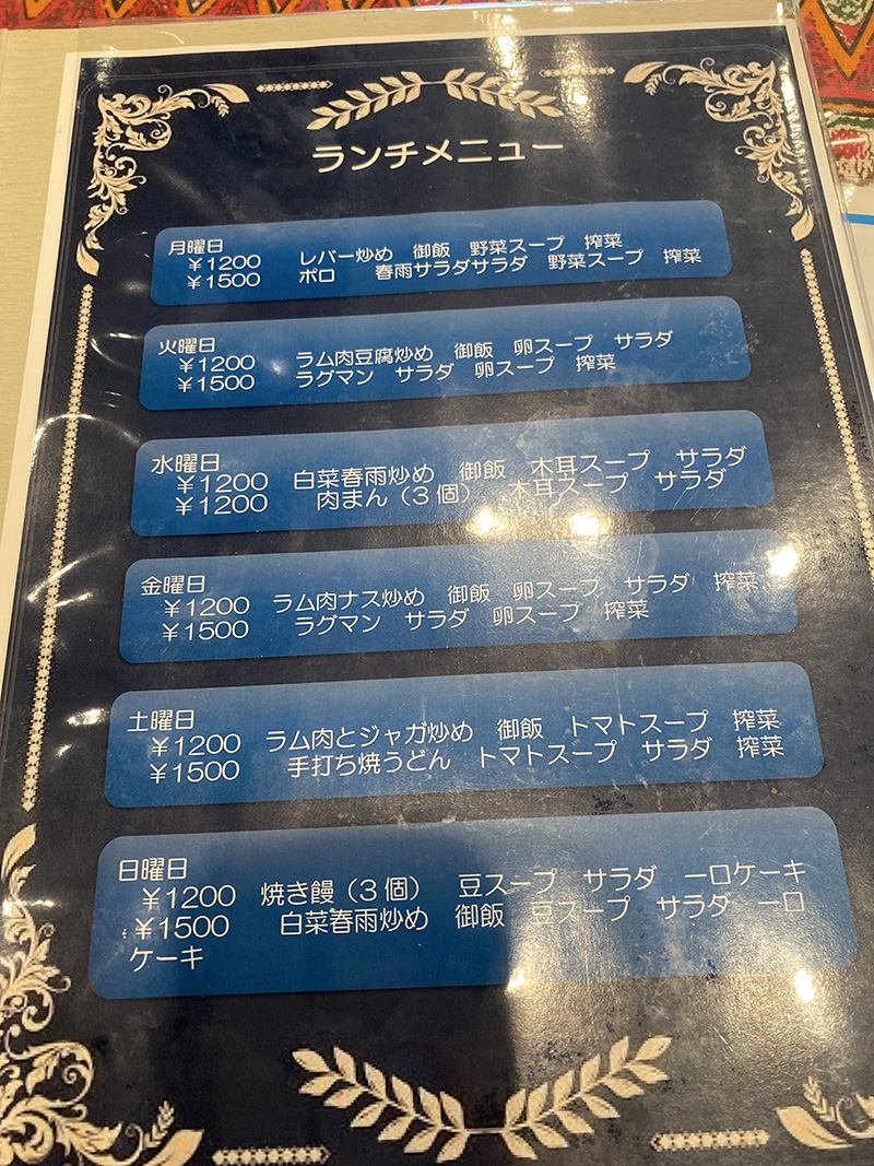 ラム肉のメニューが多く、食べたことのない料理もたくさんで興味津々です。ラム肉の麻婆豆腐のような料理も美味しそうでした。
