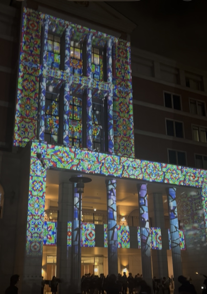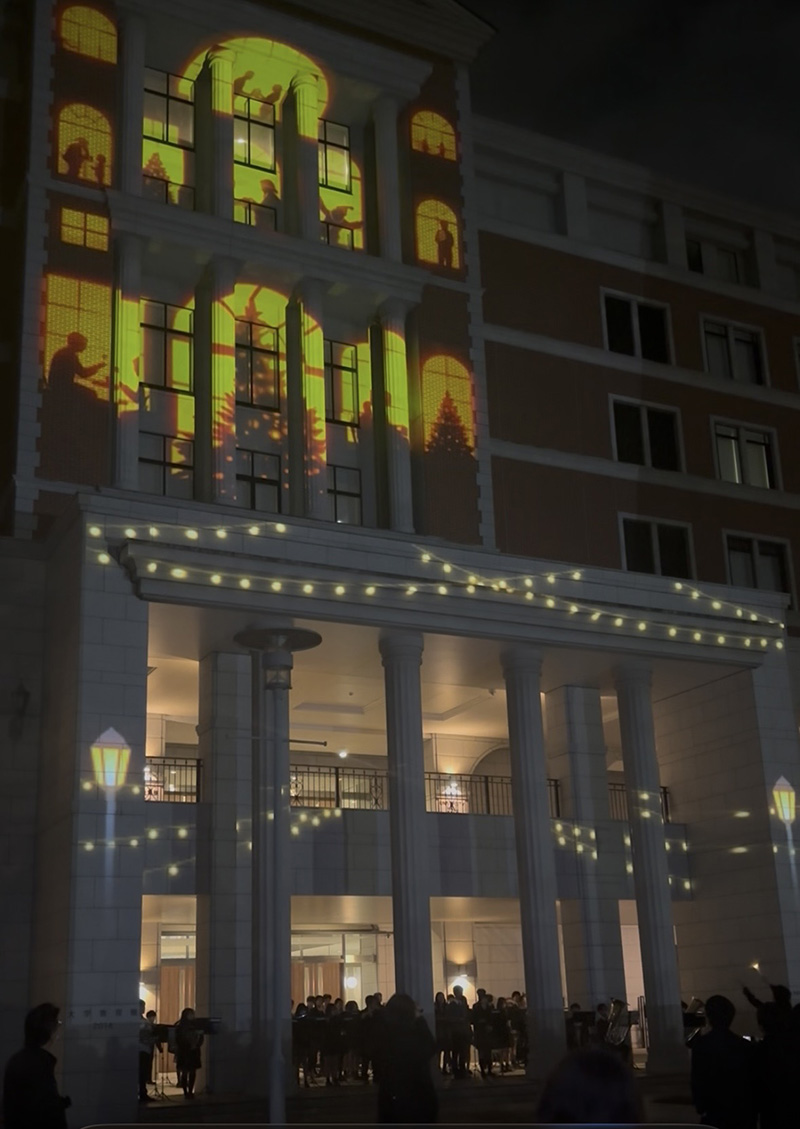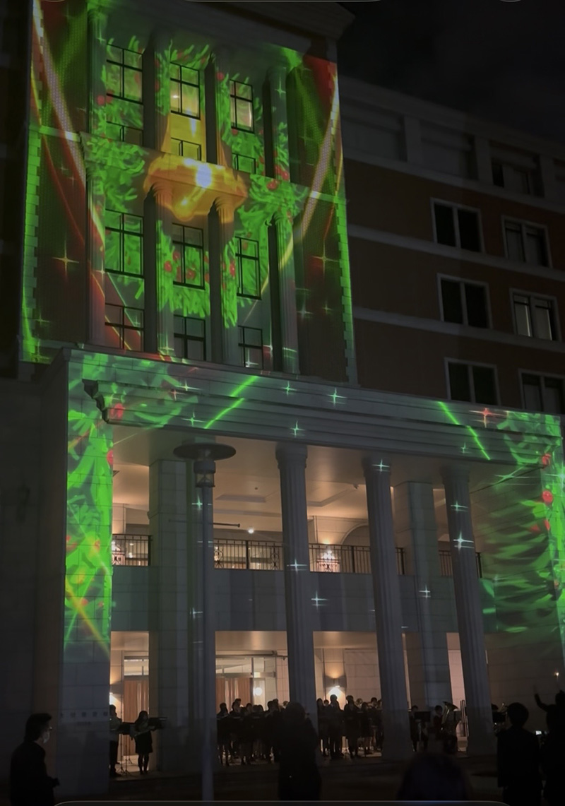 12月20日から24日はプロジェクトマッピング、日曜日夕方は吹奏楽団による生演奏とコラボレーションしていました。